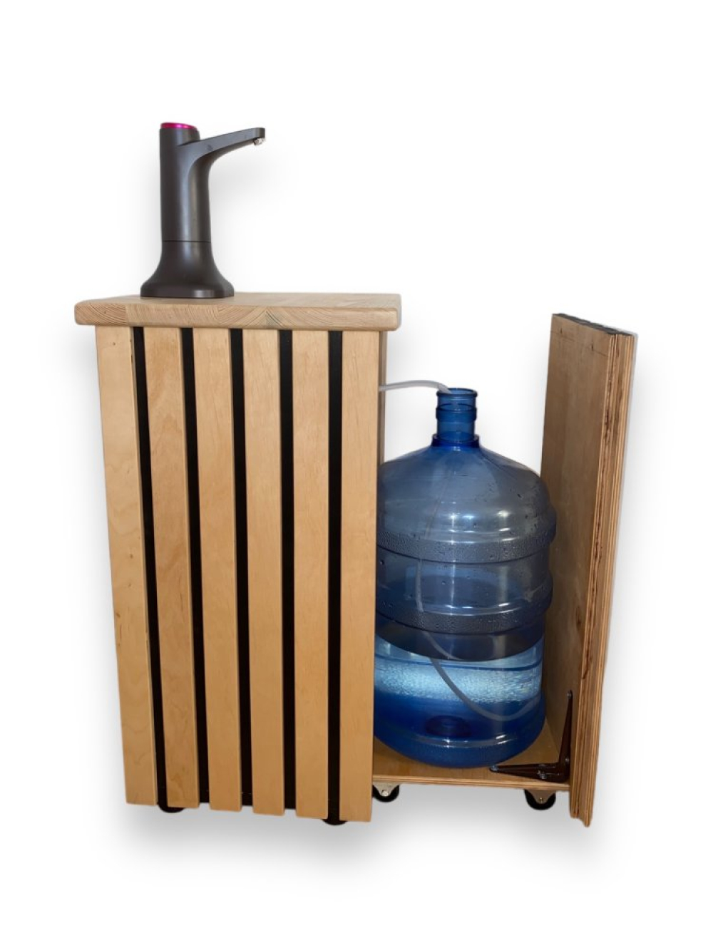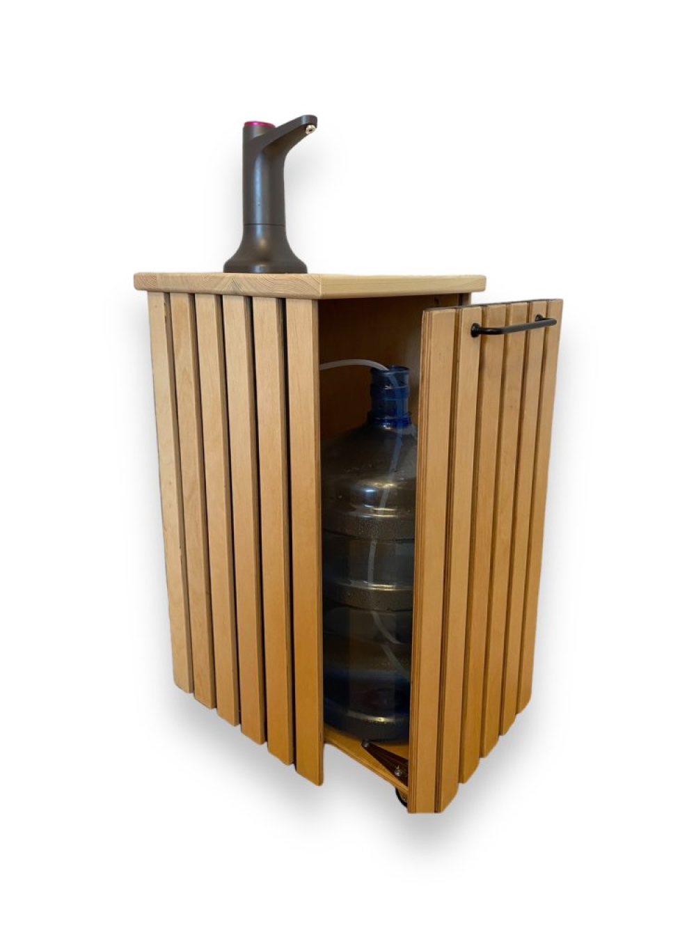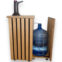 Високоякісна акумуляторна помпа для води з декоративною тумбою. Наша тумба з натуральних матеріалів виконує не тільки декоративну функцію, вона також спрощує використання бутильованої води. Тумба стоїть на колісних опорах, що істотно полегшує її переміщення при заміні бутиля. У виробництві використовуються тільки якісні матеріали українського виробництва.